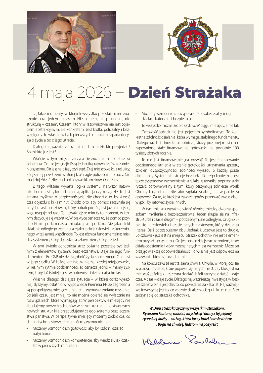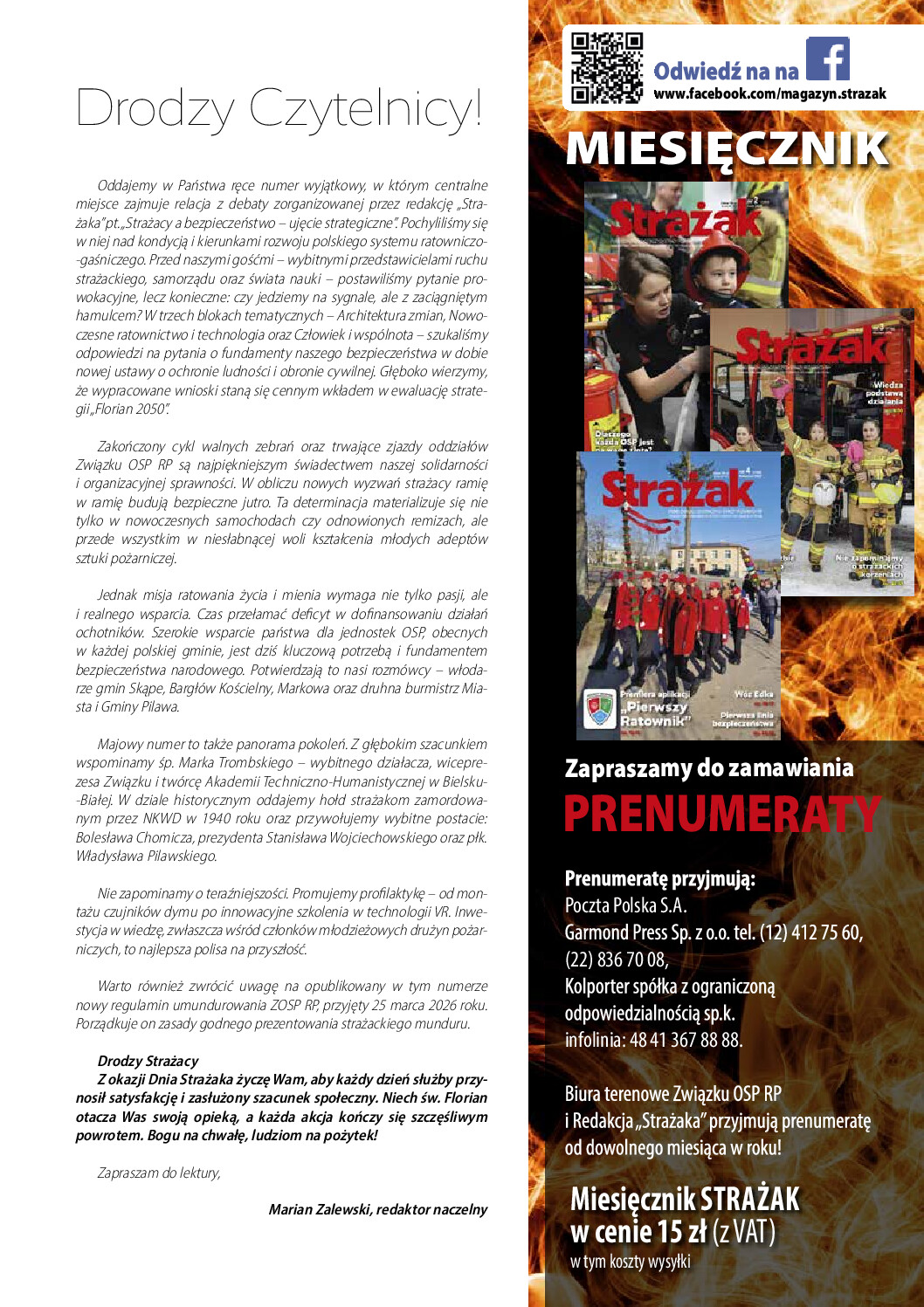 W majowym numerze „Strażaka” W majowym numerze „Strażaka” m.in.: relacja z debaty strategicznej o bezpieczeństwie, nowy regulamin umundurowania Związku OSP RP oraz bogaty serwis informacyjny z życia OSP. Zapraszamy do lektury i zachęcamy do prenumeraty! admin2026-04-30T18:40:22+02:0030 kwietnia 2026|Kategorie: Aktualności|Tagi: "Strażak"| Podziel się tą informacją FacebookTwitterRedditLinkedInWhatsAppTumblrPinterestVkEmail